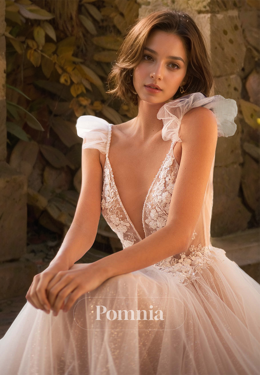 Spaghetti Straps V-Neck Corset Tulle Floral Appliques Lace Wedding Dress