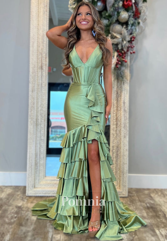 Spaghetti Straps V-Neck Ruffles Mermaid Evening Dress