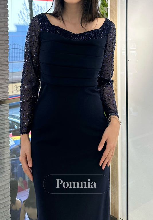 Long Sleeves Scoop Sequins Ruched Semi-Formal Dress