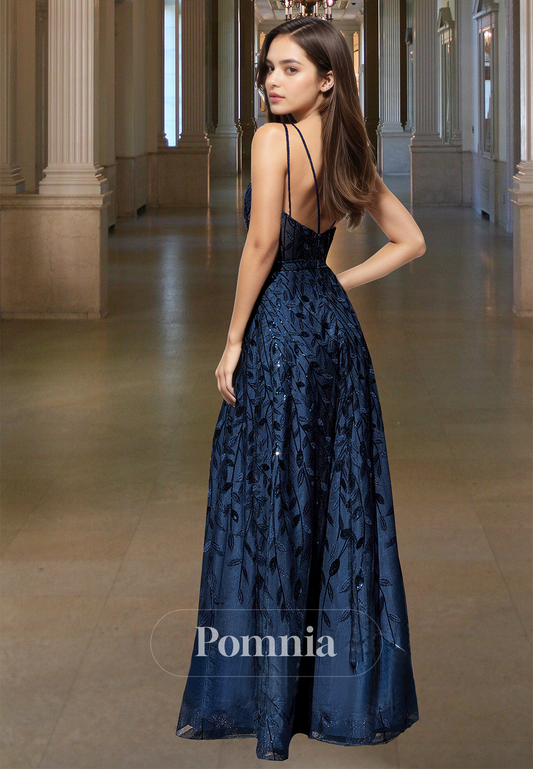 Dark Navy Spaghetti Straps V-Neck Prom Dress with Appliques Corset Evening Party Dress