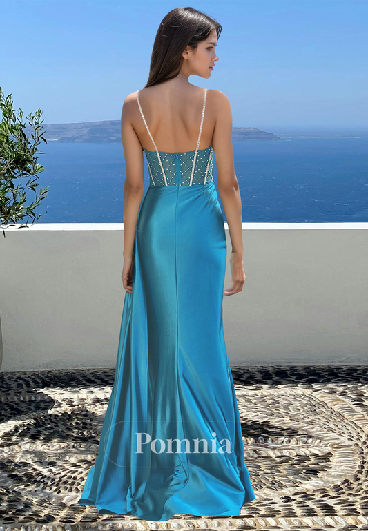 Blue Jay Spaghetti Straps Sweetheart Prom Dress with Slit Corset Tulle Evening Party Dress