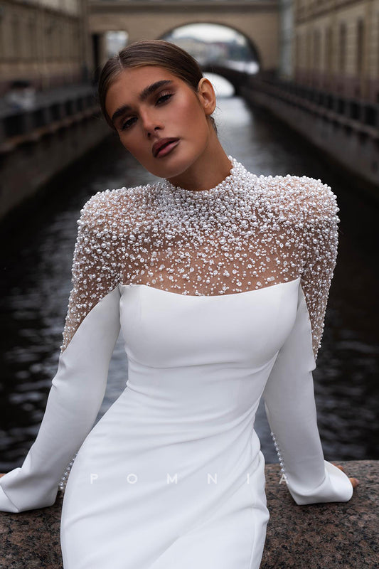 P3093 - Elegant High Neck Pearls Long Sleeves Mermaid Long Beach Wedding Dress