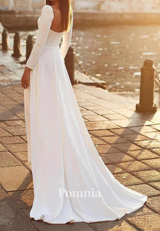 Elegant A-Line Long Sleeves Square Satin Wedding Dress