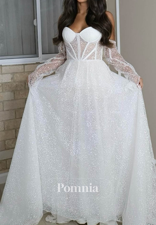 Long Sleeves Off-Shoulder Sweetheart Corset Tulle Lace Wedding Dress
