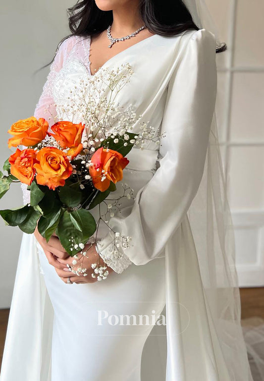 Ivory A-Line V-Neck Long Sleeves Court Train Wedding Dress With Lace