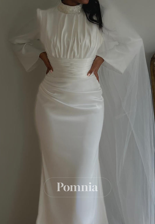 Elegant High Neck Long Sleeves Ruched Mermaid Wedding Dress