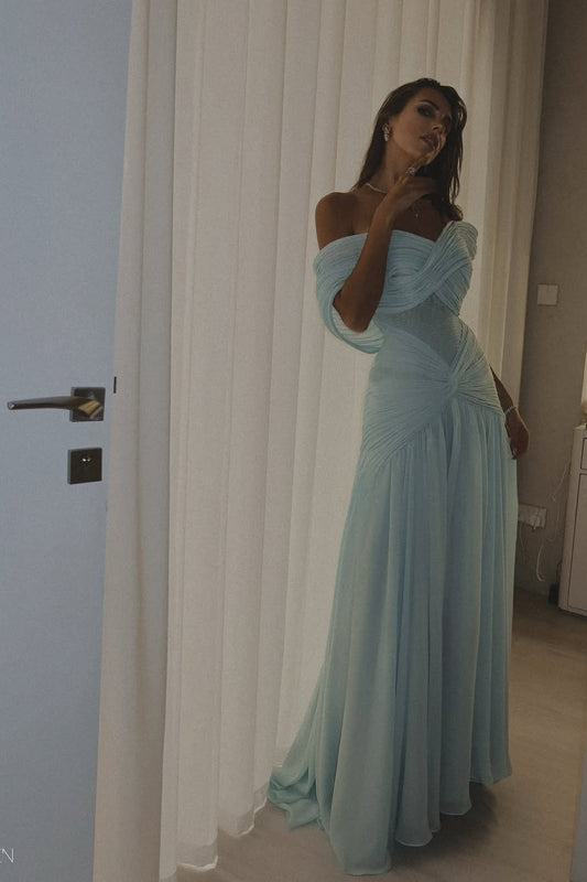 V-Neck Off-The-Shoulder Sleeveless Long Mermaid Prom Dress With Pleated