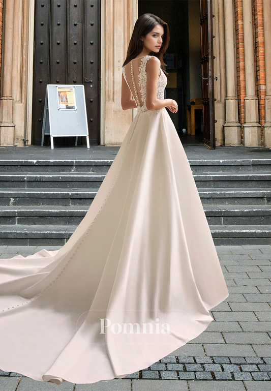 V-Neck Sleeveless Appliques Pleated Court Train Satin Wedding Dress