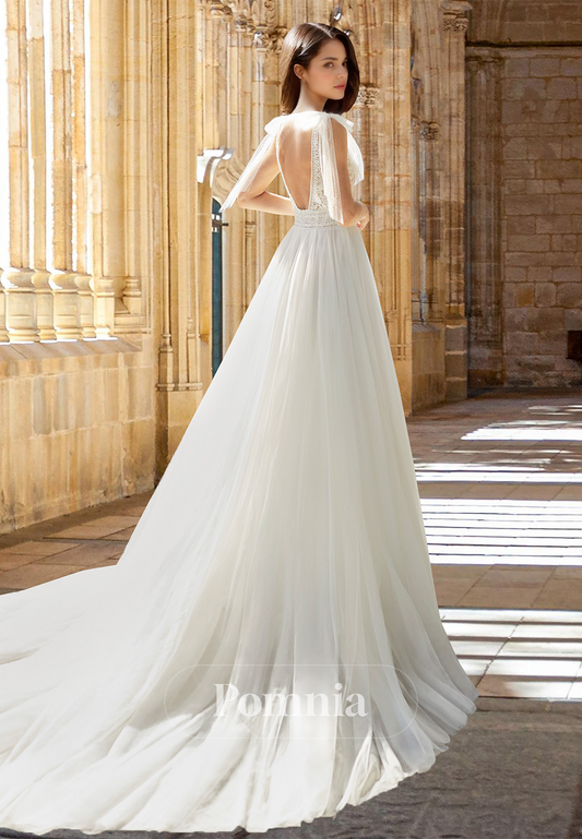 V-Neck Spaghetti Straps Appliques Lace Wedding Dress with Train Backless Beach Wedding Dress