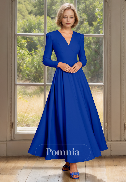 A-Line Long Sleeves V-Neck Empire-Waist Ankle-Length Mother of the Bride Dress