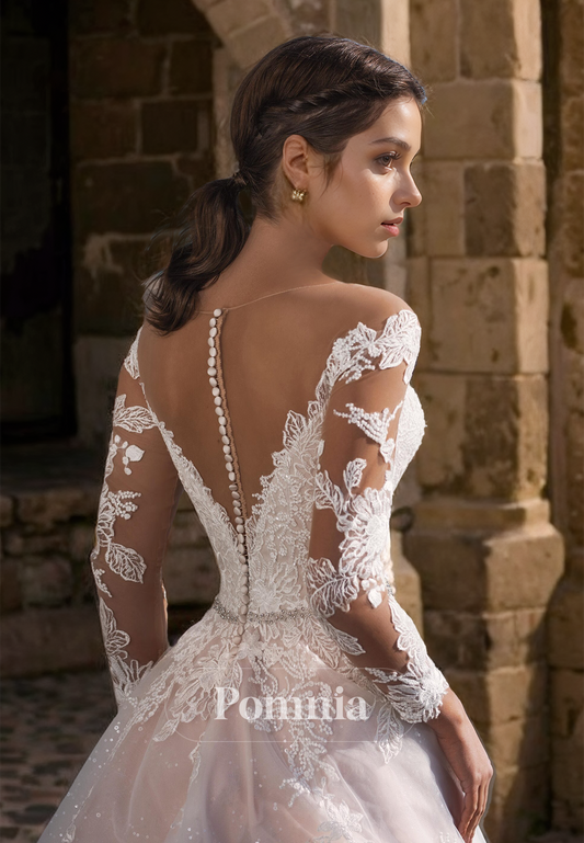 A-Line Long Sleeves Scoop Sequins Lace Wedding Dress