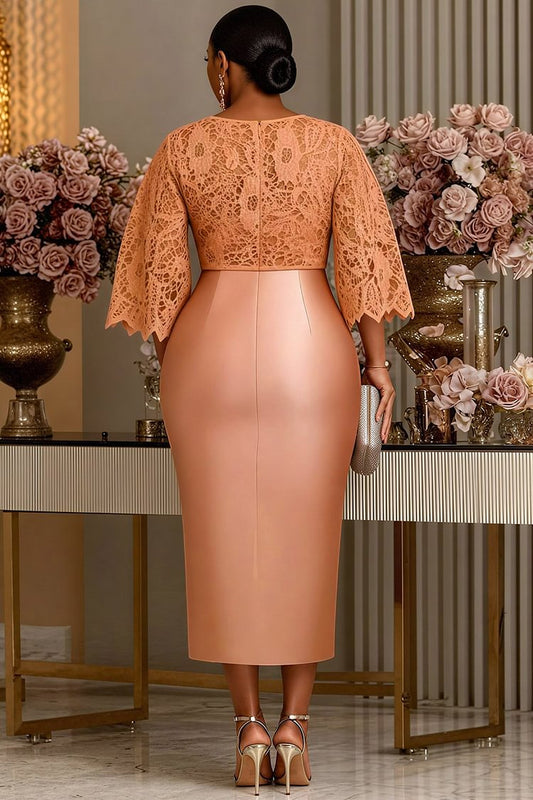 Rose Gold Round Neck Flare 3/4 Sleeve Split Satin Midi Dress