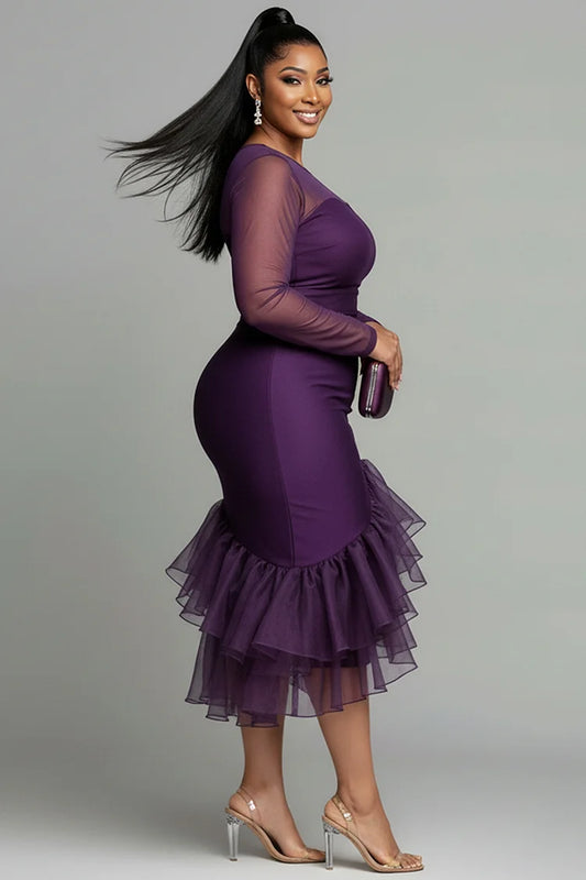 Cocktail Party Purple Round Neck Long Sleeve Ruffle Tulle Midi Dress