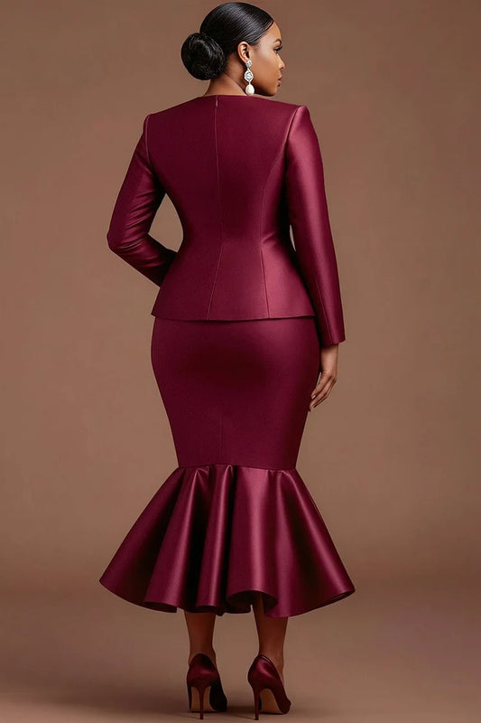 Formal Burgundy V Neck Long Sleeve 3D Elegant Bodycon Satin Two Piece Skirt Sets