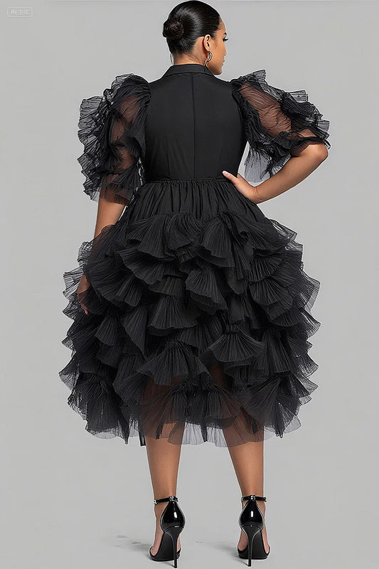Cocktail Party Black V Neck Puff Sleeve Short Sleeve Tiered Elegant Ruffle Tulle Midi Dresses