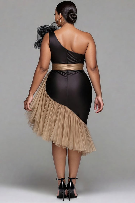 Cocktail Party Tulle Black One Shoulder Contrast Elegant 3D Satin Midi Dresses