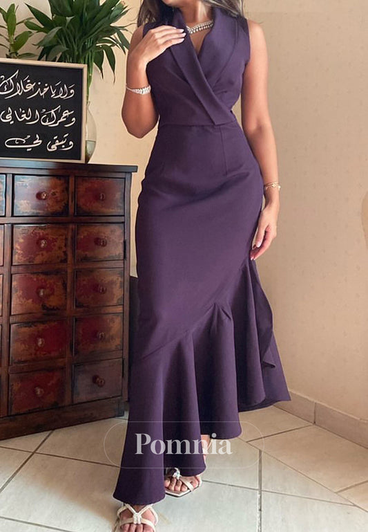 Cocktail Party Purple Cowl Neck Long Sleeve Mermaid Elegant Ruffle Velvet Midi Dress