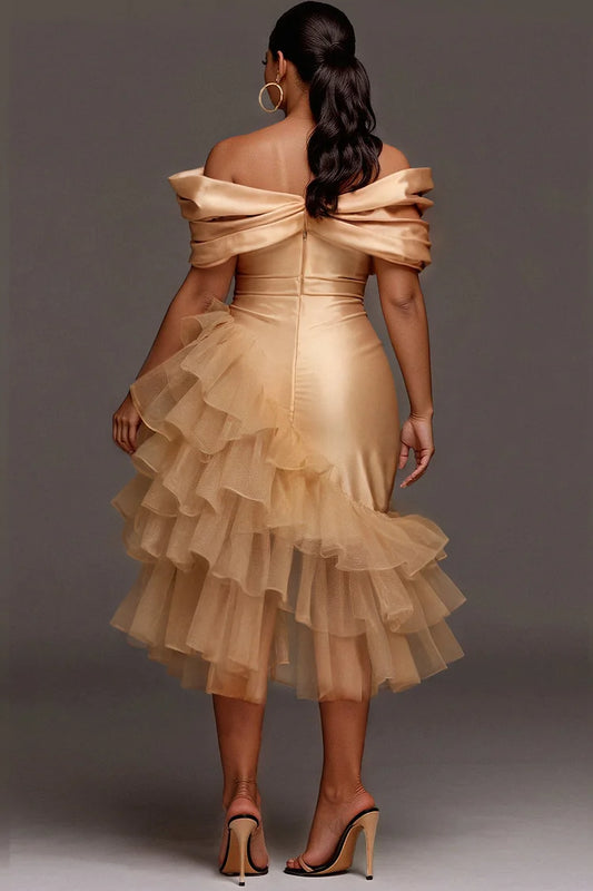 Champagne Off The Shoulder Ruffle Elegant Contrast Satin Midi Dress