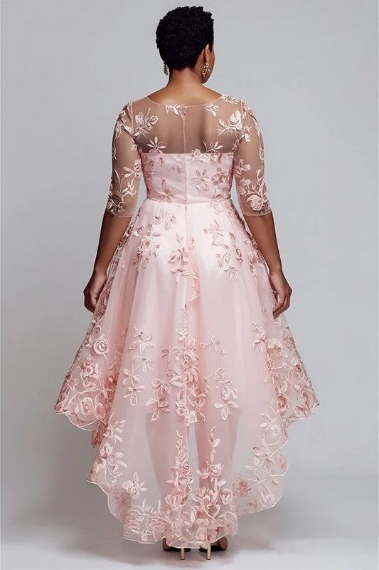 Semi Formal Pink Round Neck Half Sleeve Asymmetric Hem Elegant See Through Lace Midi Dress