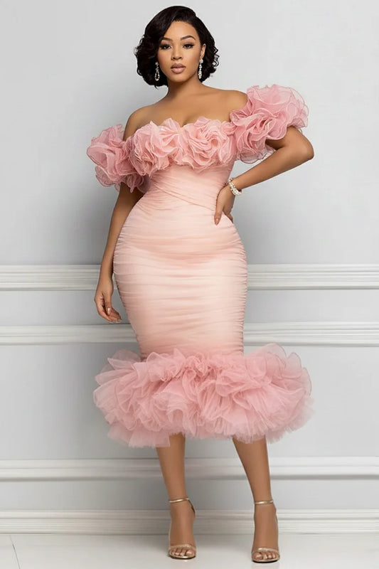 Pink Off The Shoulder 3D Elegant Bodycon Tulle Midi Dresses