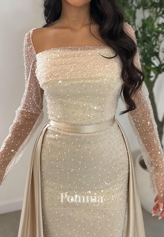 Elegant Long Sleeves Off-Shoulder Sequins Slit Ruched Evening Dress