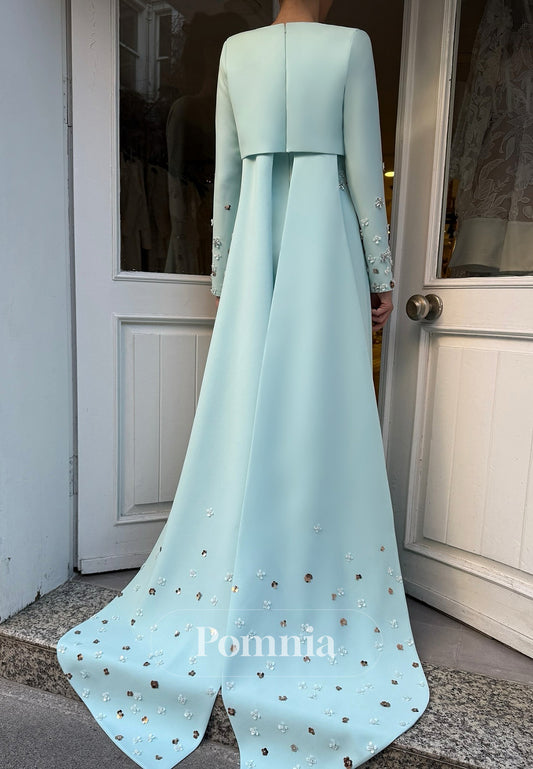 Sky Blue Long Sleeves Scoop Sequins Evening Dress