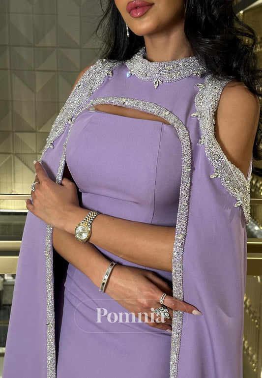 Lilac Cape Scoop Sequins Ruched Evening Dress