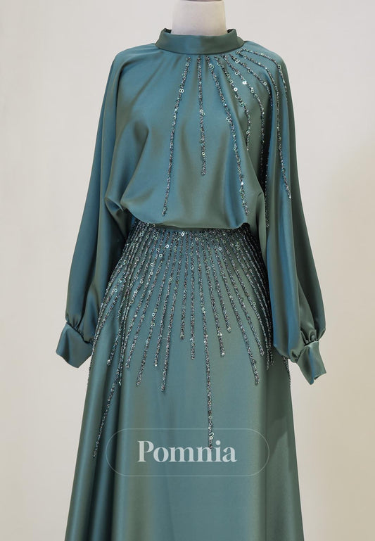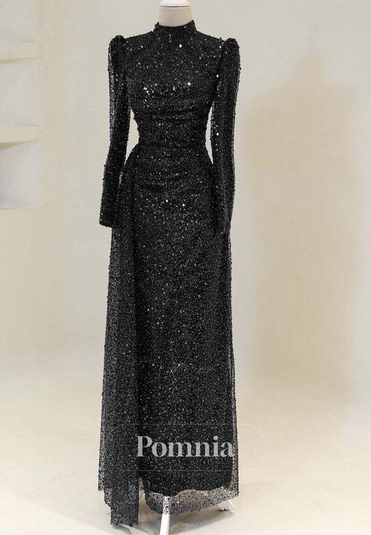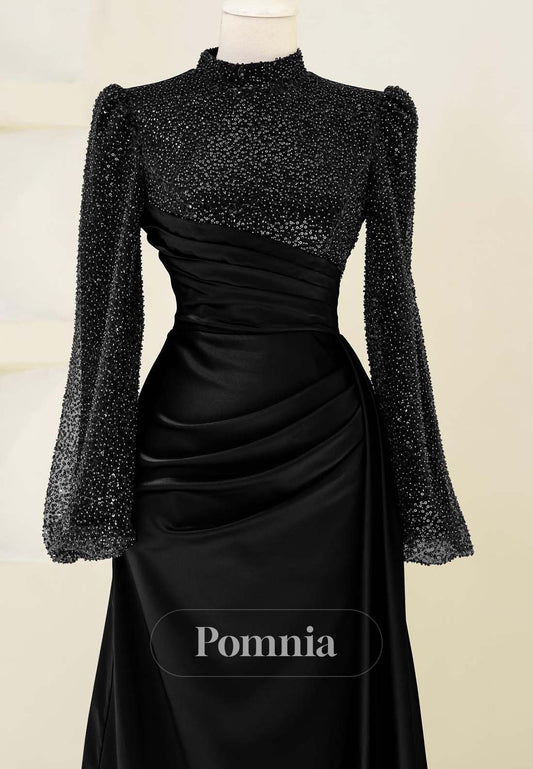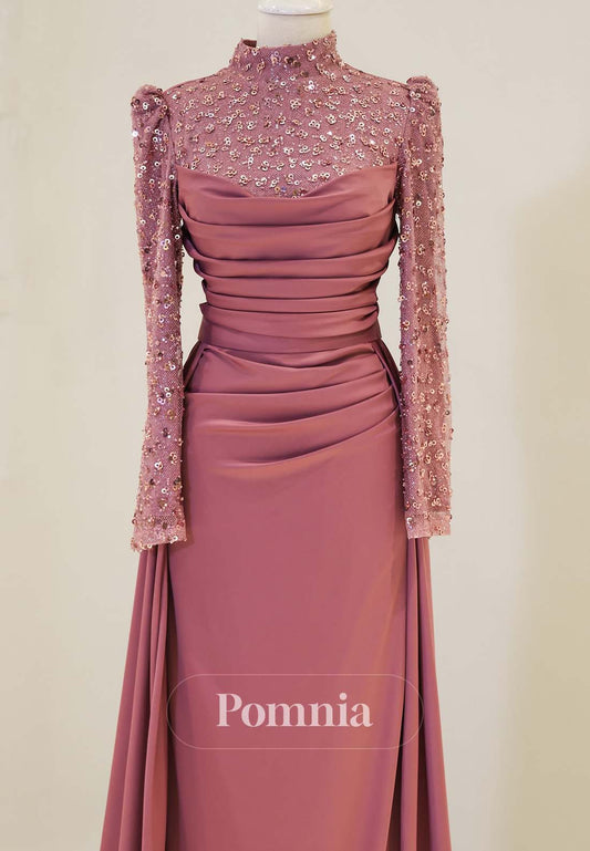 High Neck Long Sleeves Sequins Satin Formal Evening Dress