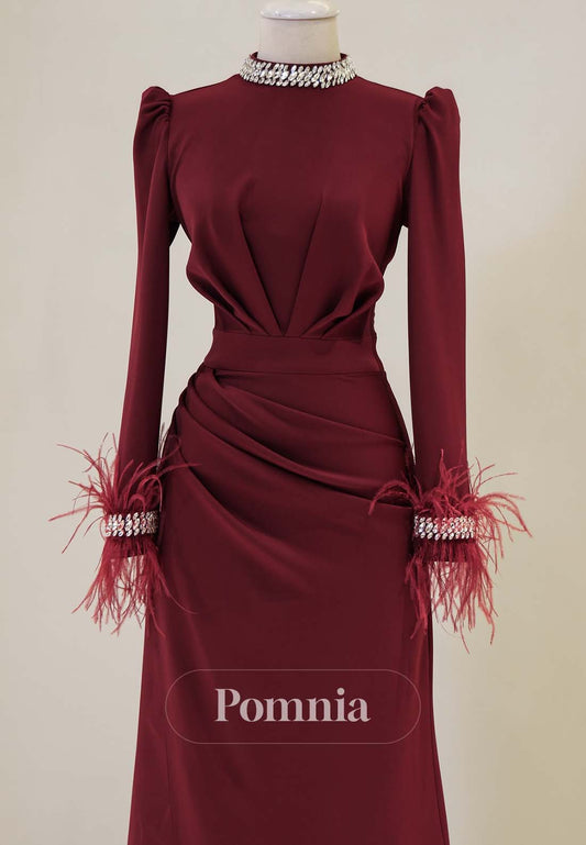 Simple High Neck Long Sleeves Ruched with Feathers Foraml Dress