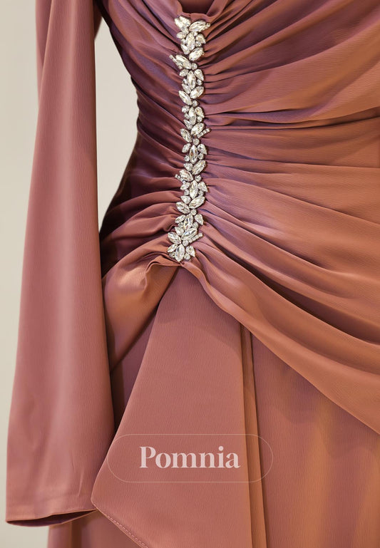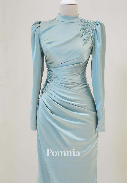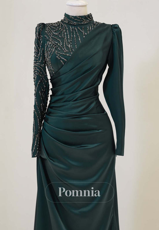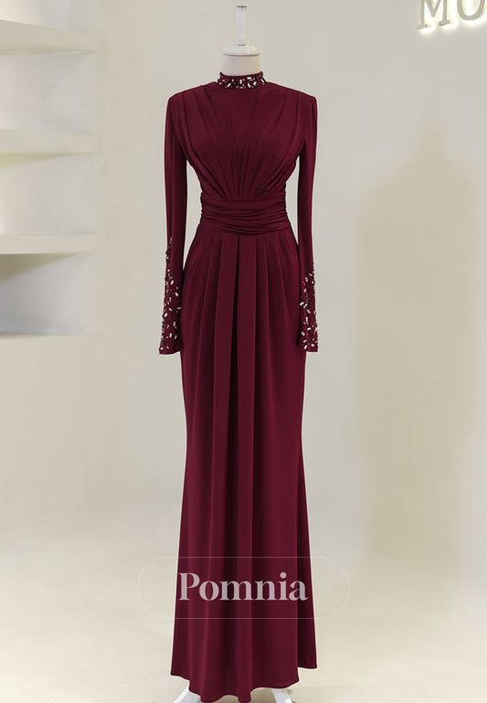 Long Sleeves High Neck Prom Dress with Beads Ruched Formal Dress
