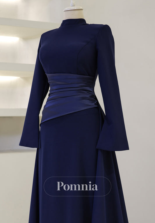 Simple Long Sleeves High Neck Ruched Empire-Waist Formal Evening Dress