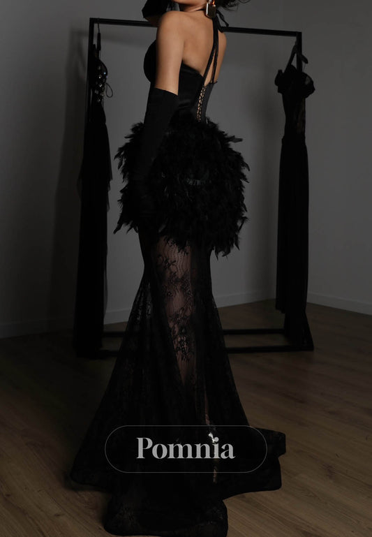 Black Halter Sleeveless Backless Feathers Prom Dress