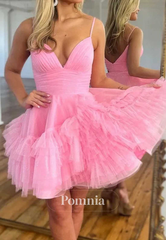 A-Line Spaghetti Straps V-Neck Ruffles Homecoming Dress