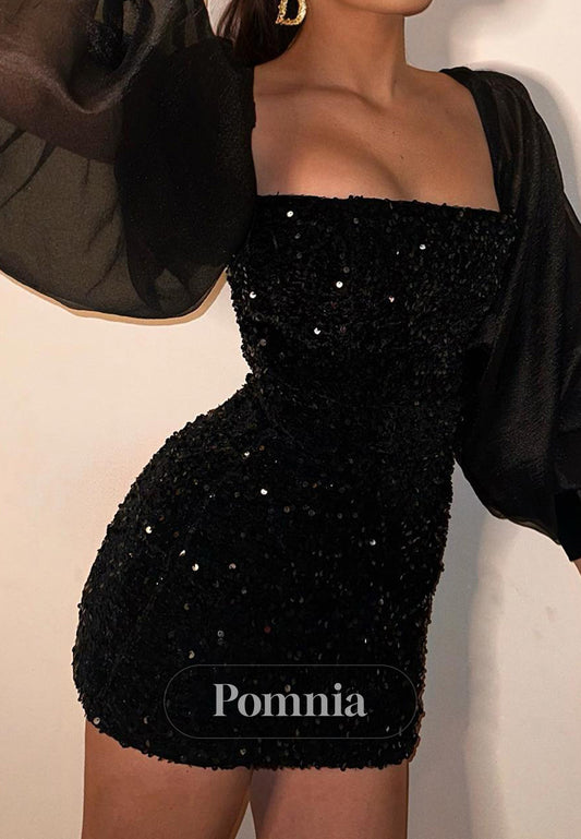 Black Long Sleeves Scoop Sequins Homecoming Dress