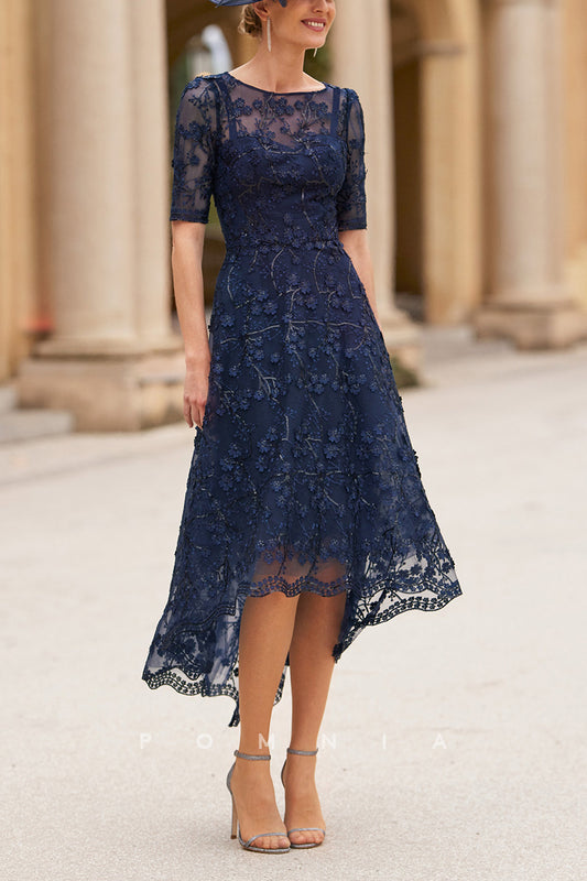 P9078 - A-Line Empire-Waist Sleeves Lace Appliques Illusion Neck Mother of Bride Dress