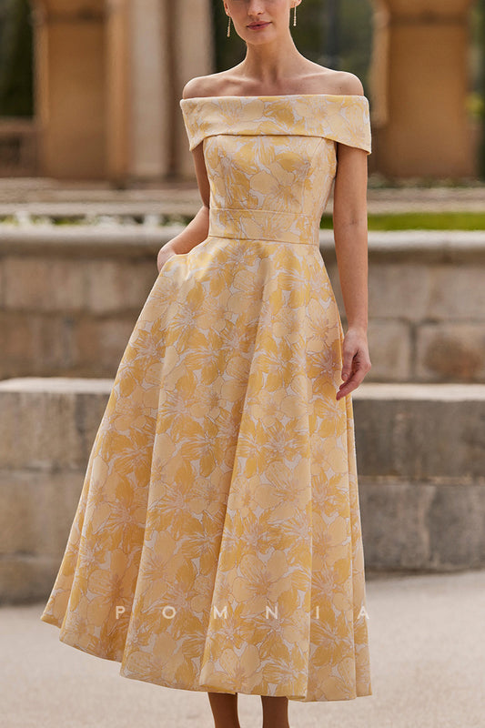 P9087 - Off-Shoulder A-Line Empire-Waist Printed Long Mother of Bride Dress