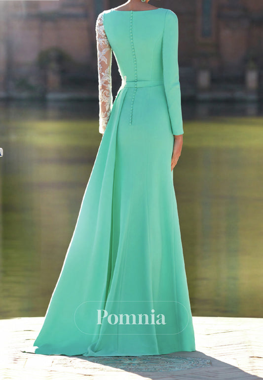 A-Line Long Sleeves Empire-Waist Slit Appliques Evening Dress