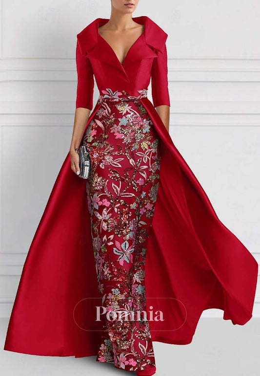 Pine Satin Mermaid V-Neck Long Mother of the Bride Dress with Sleeves