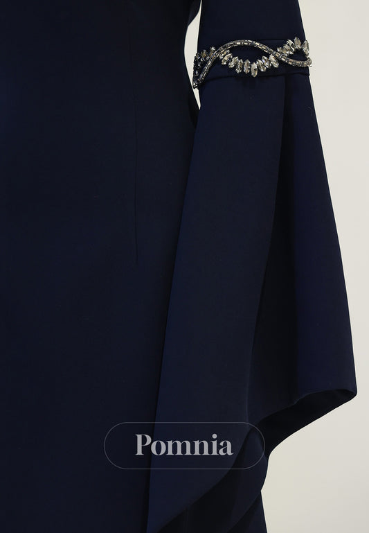 Navy Sheath Chiffon Ruffled Ruched Long Mother of the Bride Dress with Sleeves