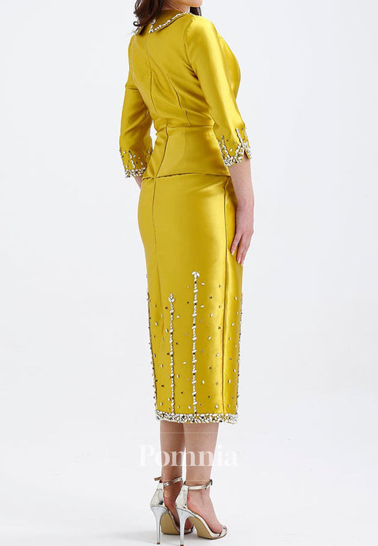 Long Sleeves V-Neck Knee-Length Satin Mother of the Bride Dress