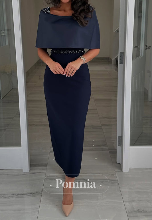 Navy White Sheath Round Neck Midi Mother of the Bride Dress with Cape