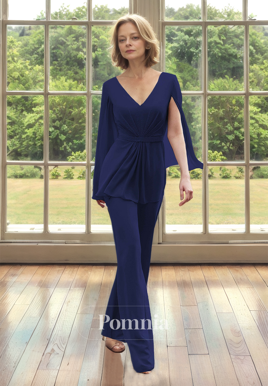 Jumpsuit Cap Sleeves V-Neck Empire-Waist Chiffon Mother of the Bride Dress