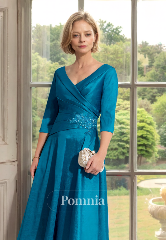 Eucalyptus A-Line V-Neck 3/4 Sleeves Empire-Waist Appliques Mother of the Bride Dress