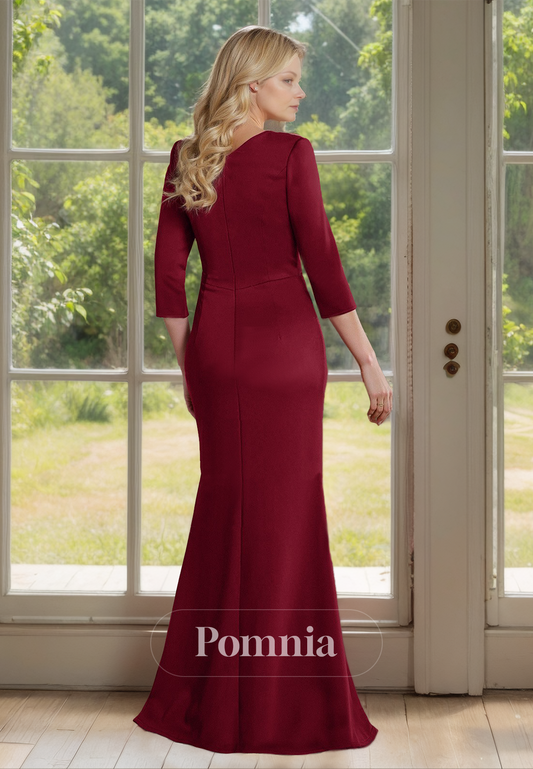 Burgundy Sheath V-Neck 3/4 Sleeves Empire-Waist Mother of the Bride Dress