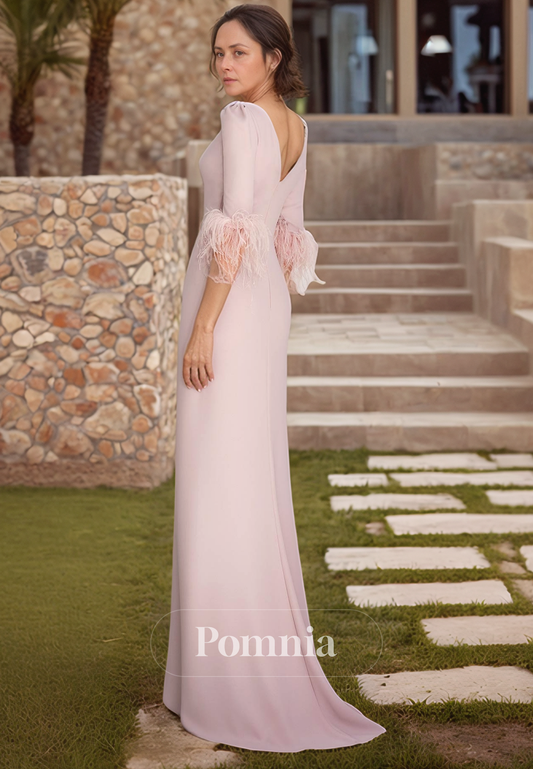 Blushing Pink Scoop Half Sleeves Feathers Slit Mother of the Bride Dress