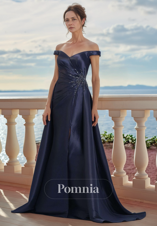 Elegant Off-Shoulder Appliques Ruched Satin Mother of the Bride Dress