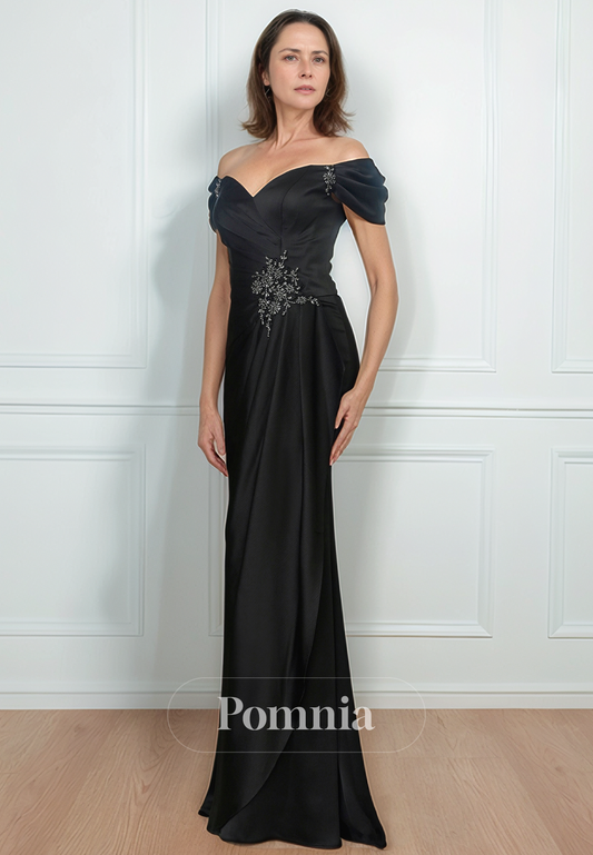 Sheath Off-Shoulder Floor-Length Beads Satin Mother of the Bride Dress