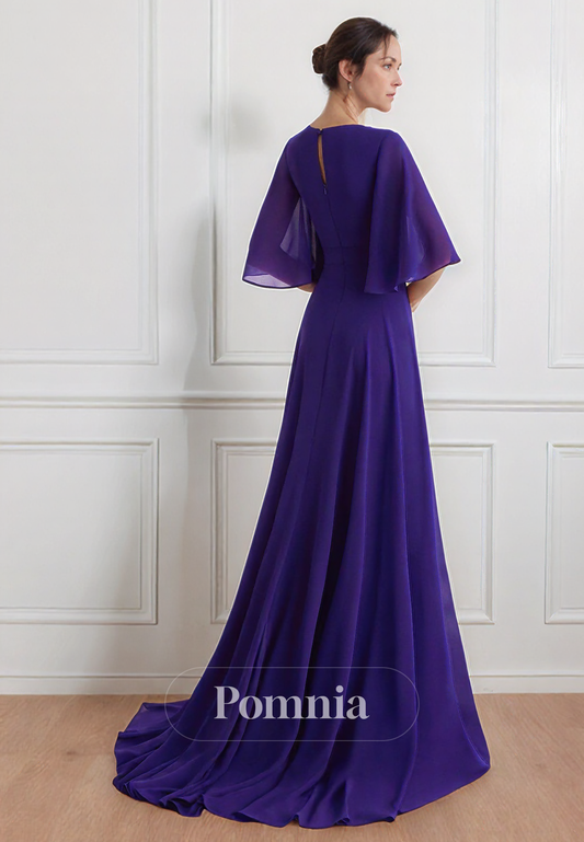 Regency V-Neck Short Sleeves Sweep Train Chiffon Mother of the Bride Dress