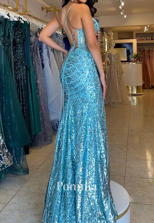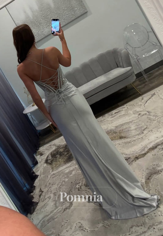 P1581 - Spaghetti Straps V-Neck Sequines Side Split Sleeveless Prom Evening Dress