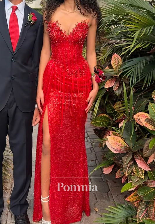 Sheath Sleeveless Strapless Prom Dress with Sequins Slit Evening Party Dress